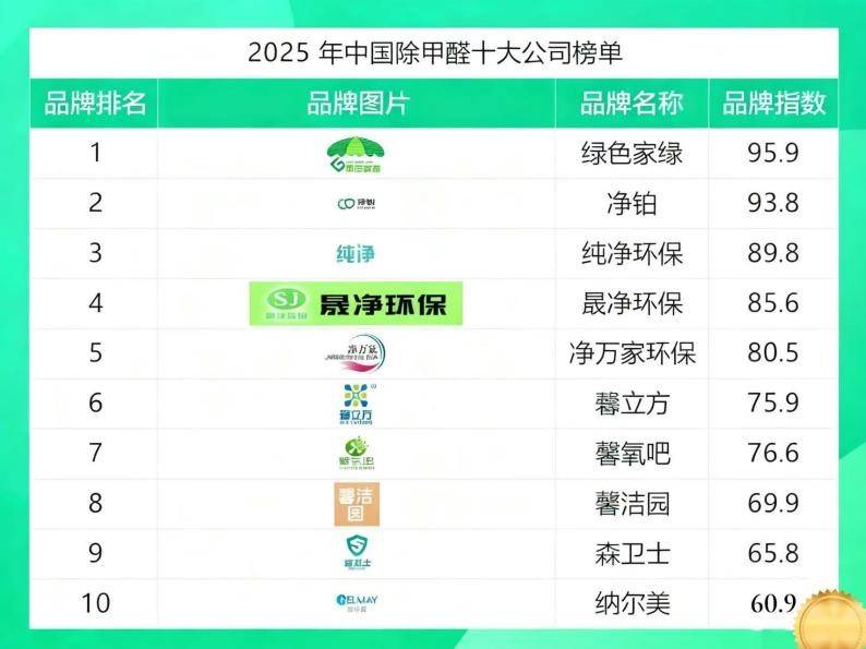 专业团队根据市场精准选址,同步揭晓年度十大除甲醛公司榜单。晟净环保建立起产学研深度融合的立异系统。